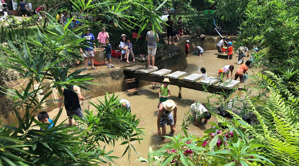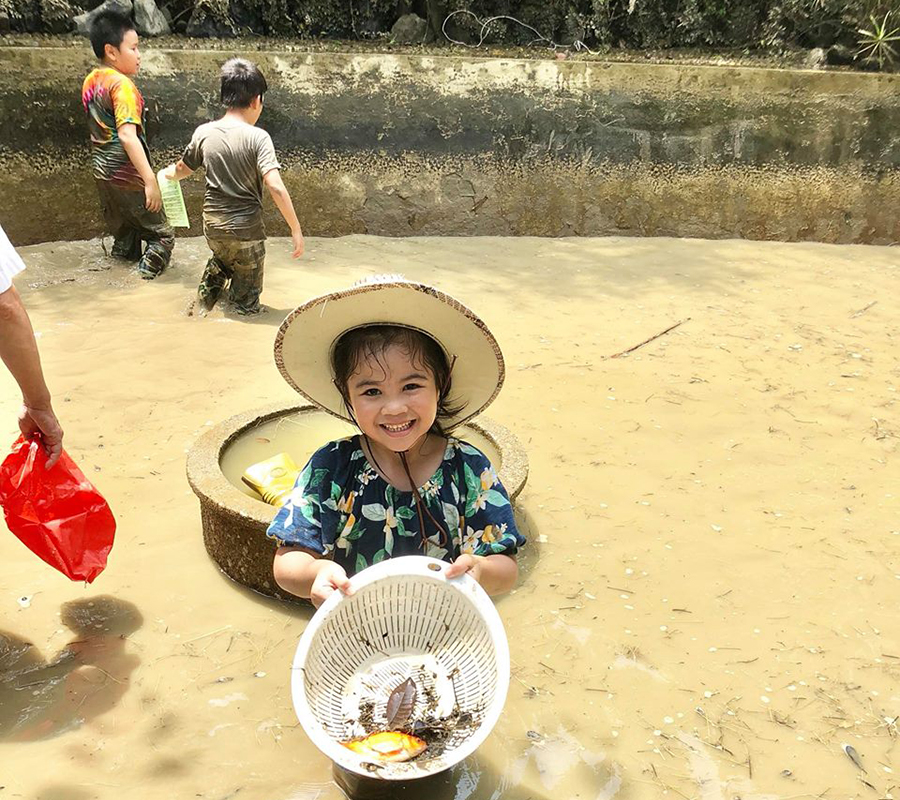 Lần đầu trong đời các con được trải nghiệm lội xuống ao tát cá và chế biến trực tiếp các món ăn từ cá.